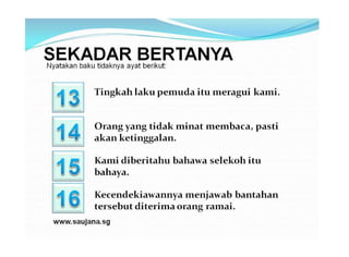 Panjang karangan anda hendaklah antara 200 hingga 250 patah perkataan. Senarai Konstruk Untuk Pentaksiran Di Prasekolah TUNJANG KONSTRUK Komunikasi BM1 Kemahiran Mendengar BM2 Kemahiran Bertutur BM3 Kemahiran Menyebut dan Mengecam Huruf Vokal dan Konsonan BM4 Kemahiran Membaca Perkataan BM5 Kemahiran Membaca Ayat BM6 Kemahiran Mencerita Semula BM7 Kemahiran Menulis Kemanusiaan KM1 Pengetahuan. Ayat yang terlalu panjang dan berbelit-belit hendaklah dielakkan kerana ayat sedemikian akan menyukarkan kefahaman pembaca.